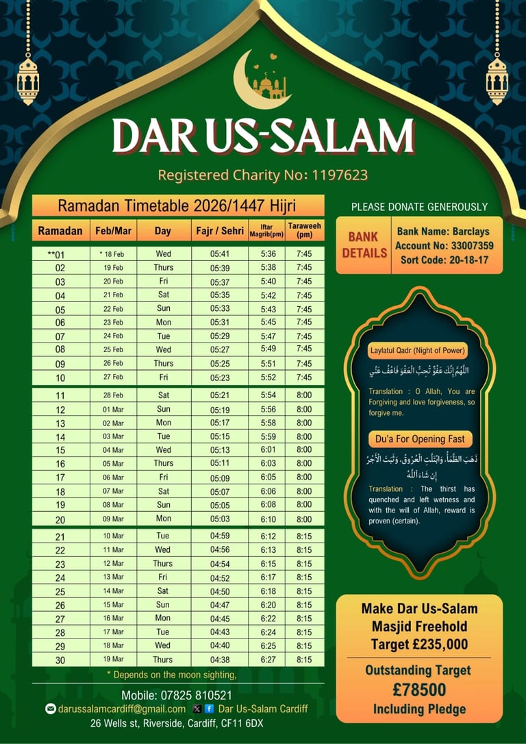 Masjid Dar Us-Salam in Cardiff offers a welcoming community for worship, learning, and charity. Join us to participate in prayers, activities, and support our mission.